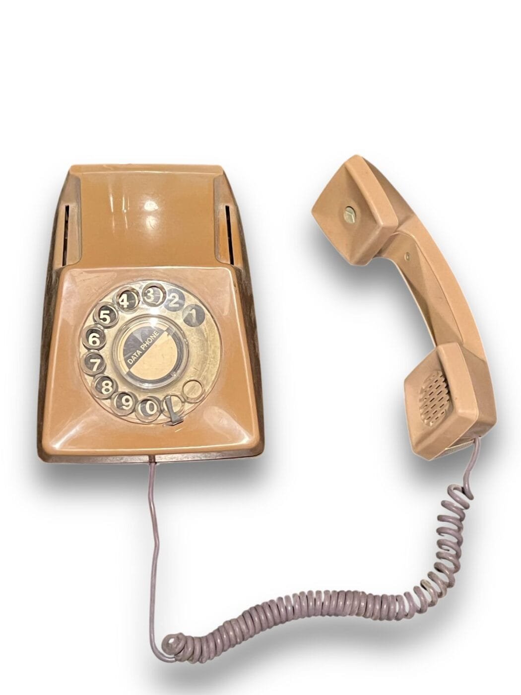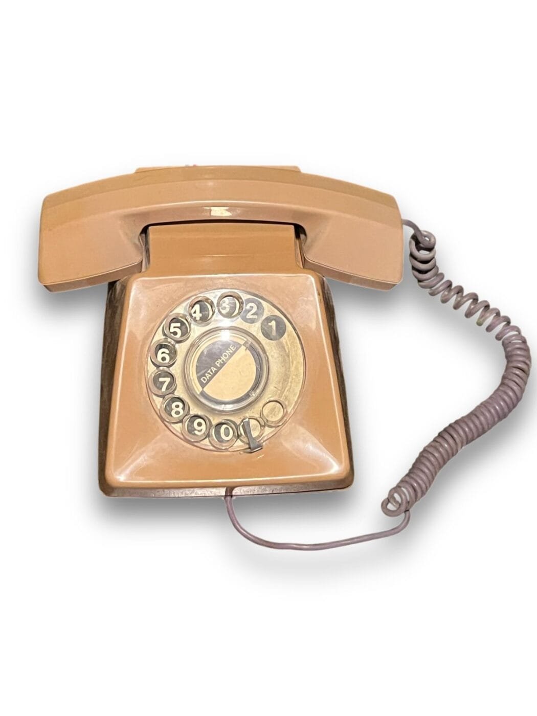 A vintage rotary telephone, likely a model from the 1970s.