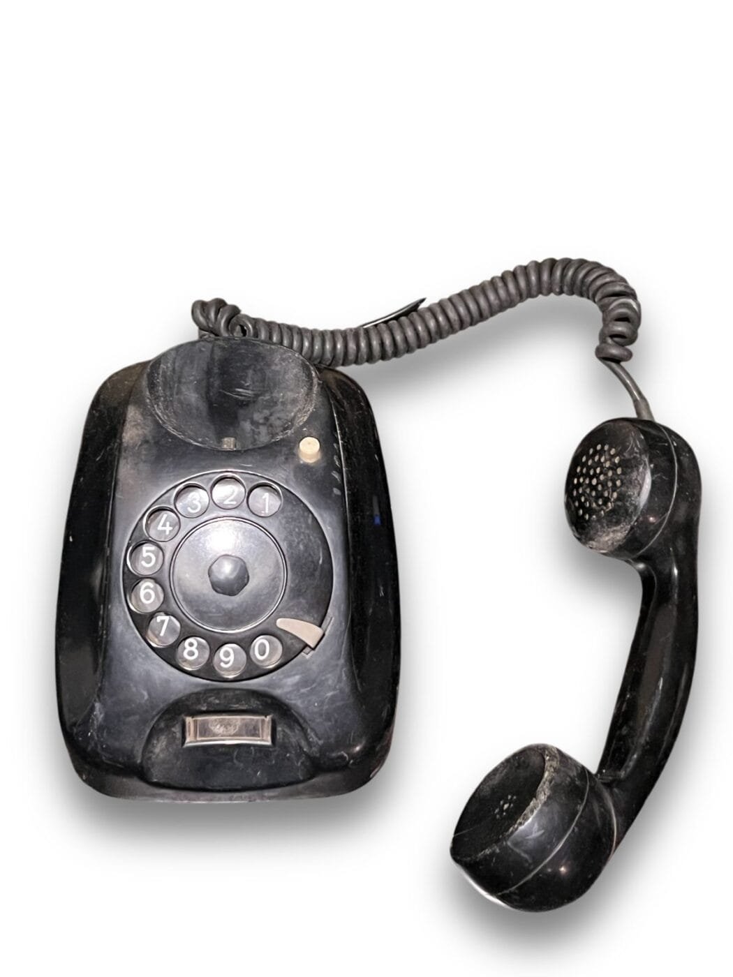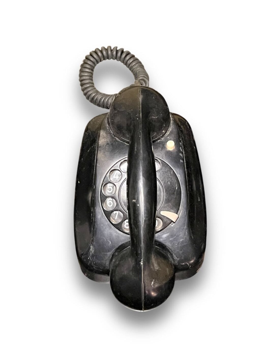 Rotary phones like this one were used on analog lines and are now often sought after as collectible or art direction and scenography prop.