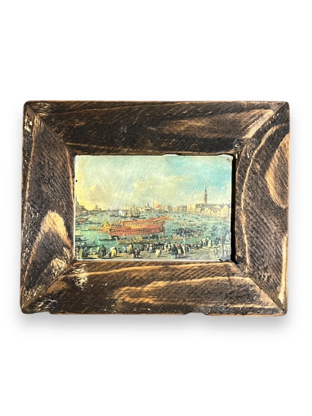 The small framed picture is a print of an 18th-century painting depicting a Venetian festival scene. The artwork shows the Doge (the elected head of Venice) in his magnificent, gilded ceremonial barge, known as the Bucentaur.