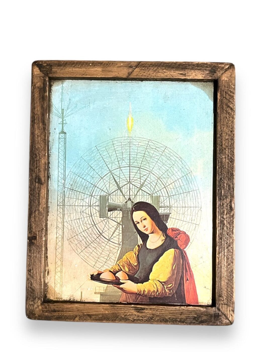 A piece of contemporary mixed media art that incorporates an image of the Virgin Mary from Leonardo da Vinci’s painting, The Annunciation, into a modern setting with a large radar or satellite dish.