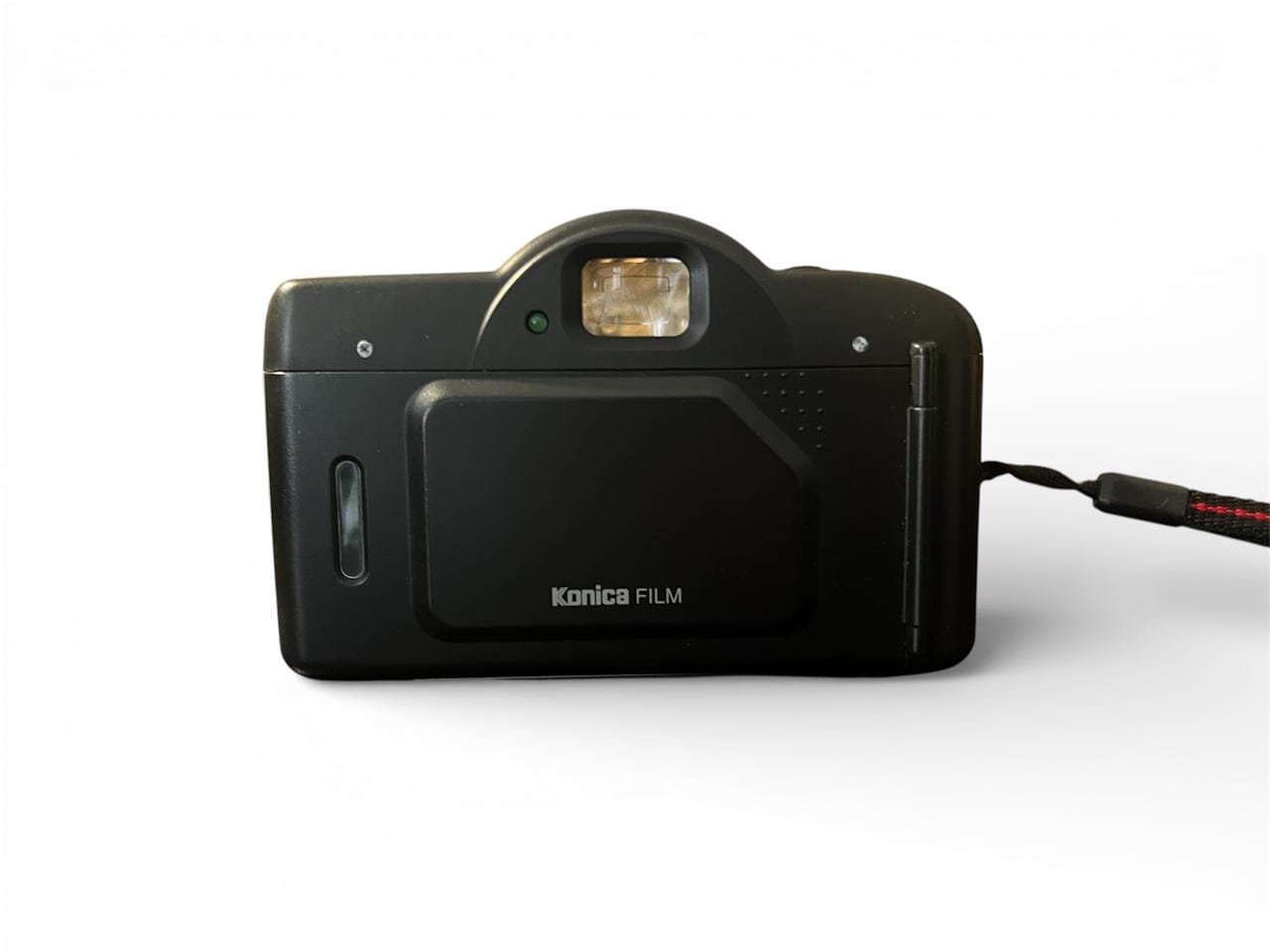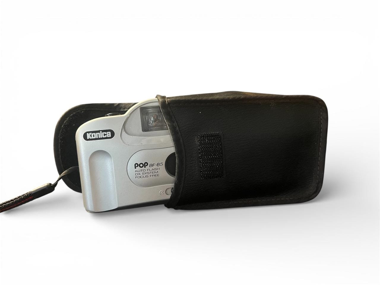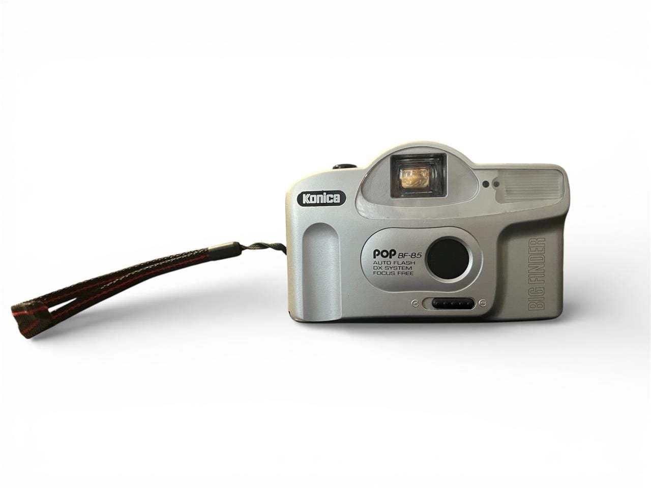 A Konica Pop BF-85, a vintage 35mm compact film camera featuring a “Big Finder” for easier viewing. This point-and-shoot camera is designed for simple, automatic operation.