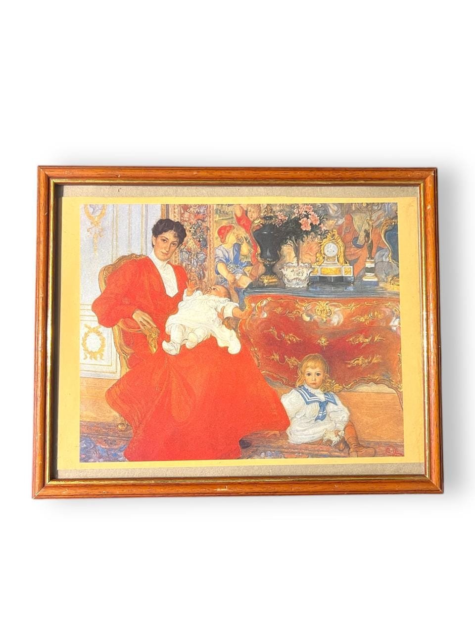 Subject: The portrait features Mrs. Dora Lamm (born Upmark) seated in a rococo chair, dressed in a vibrant red gown with white lace. She is holding her youngest son, Carl Johan, who is wearing a white baby outfit. Her eldest son, Gustav, is seated on the floor at her feet.